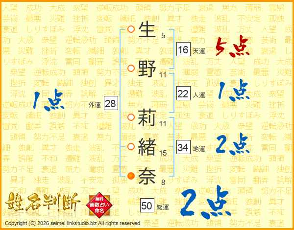 生(5画)野(11画) 莉(11画)緒(15画)奈(8画)