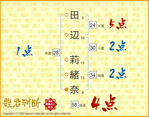 田(5画)辺(19画) 莉(11画)緒(15画)奈(8画)