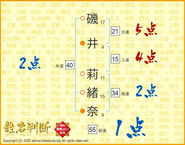 磯(17画)井(4画) 莉(11画)緒(15画)奈(8画)