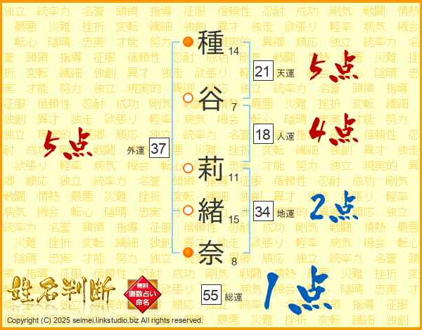種谷莉緒奈さんの外運は37画の5点!