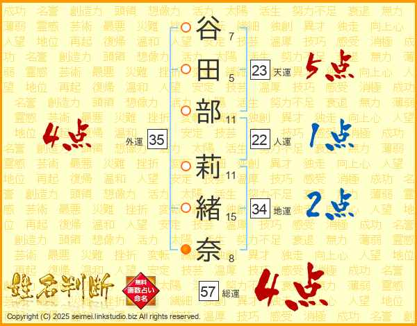 谷(7画)田(5画)部(11画) 莉(11画)緒(15画)奈(8画)