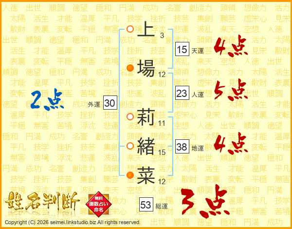 上(3画)場(12画) 莉(11画)緒(15画)菜(12画)