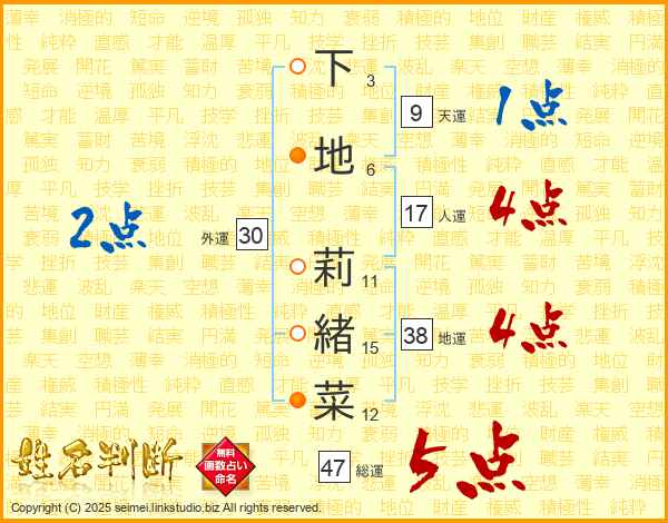 下(3画)地(6画) 莉(11画)緒(15画)菜(12画)