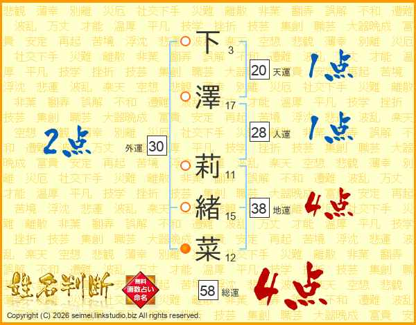 下澤莉緒菜さんの総運は58画の4点!