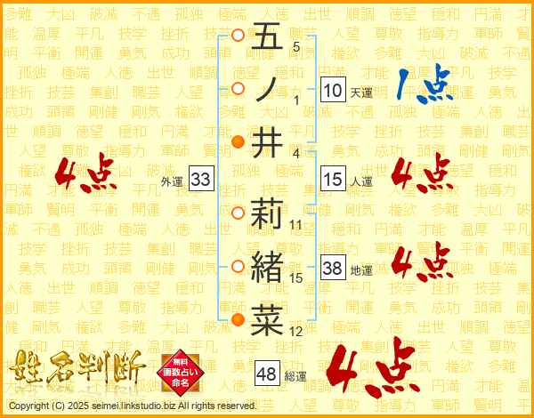 五(5画)ノ(1画)井(4画) 莉(11画)緒(15画)菜(12画)