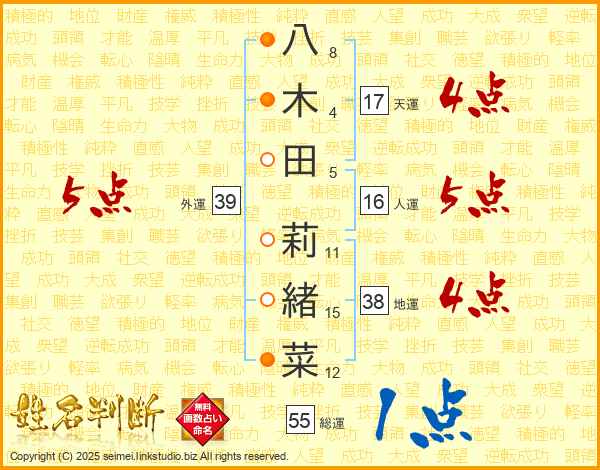 八(8画)木(4画)田(5画) 莉(11画)緒(15画)菜(12画)
