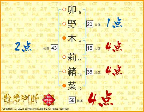 卯(5画)野(11画)木(4画) 莉(11画)緒(15画)菜(12画)