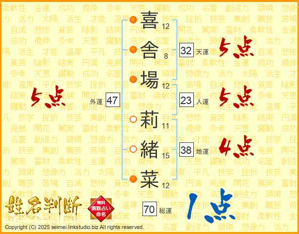 喜(12画)舎(8画)場(12画) 莉(11画)緒(15画)菜(12画)