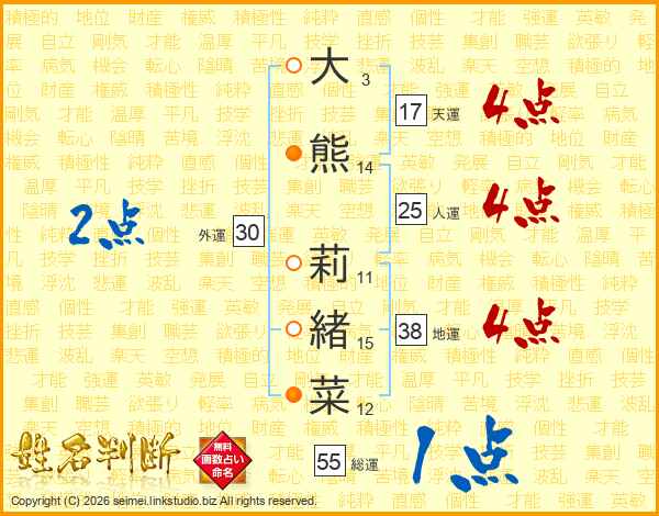 大熊莉緒菜さんの天運は17画の4点!