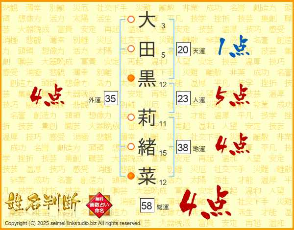 大(3画)田(5画)黒(12画) 莉(11画)緒(15画)菜(12画)
