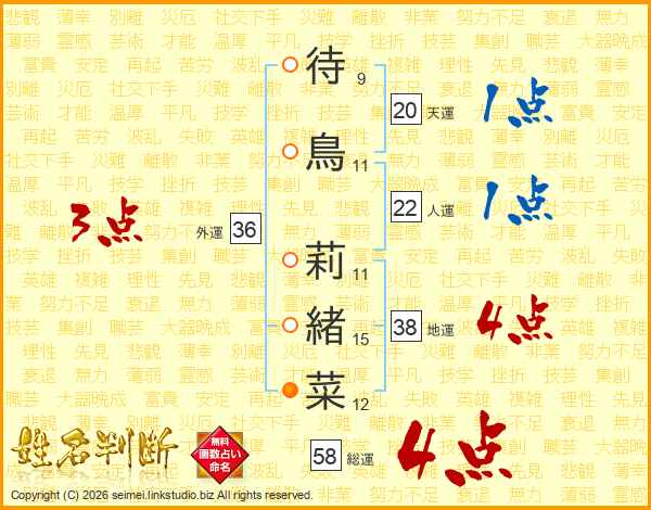 待(9画)鳥(11画) 莉(11画)緒(15画)菜(12画)