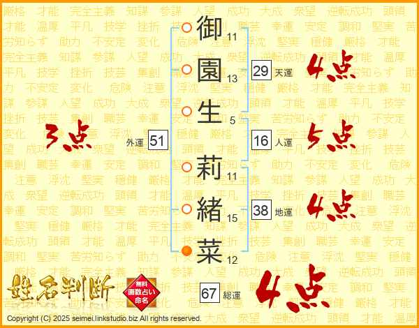 御(11画)園(13画)生(5画) 莉(11画)緒(15画)菜(12画)