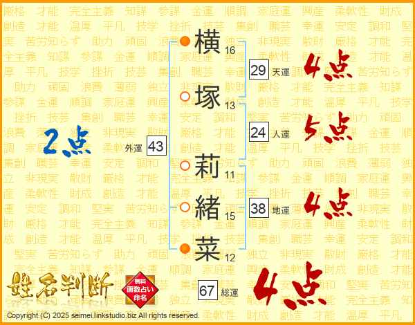 横塚莉緒菜さんの総運は67画の4点!