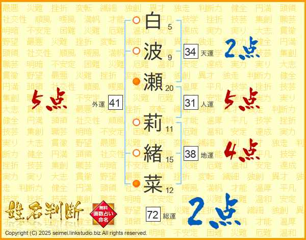 白(5画)波(9画)瀬(20画) 莉(11画)緒(15画)菜(12画)