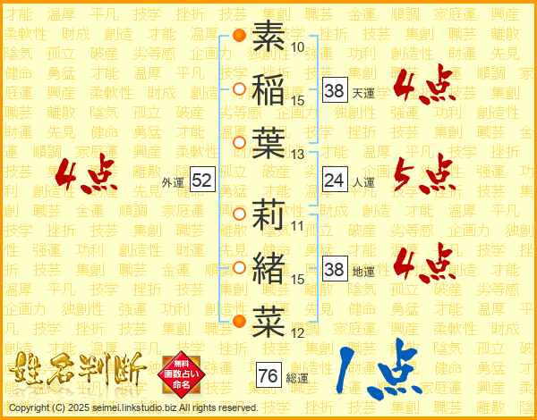 素(10画)稲(15画)葉(13画) 莉(11画)緒(15画)菜(12画)