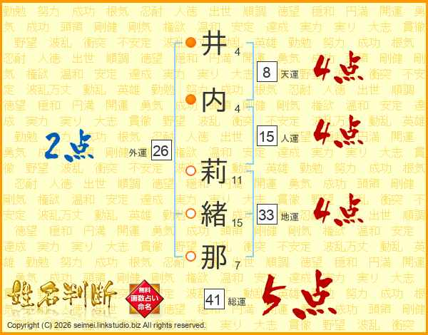 井(4画)内(4画) 莉(11画)緒(15画)那(7画)
