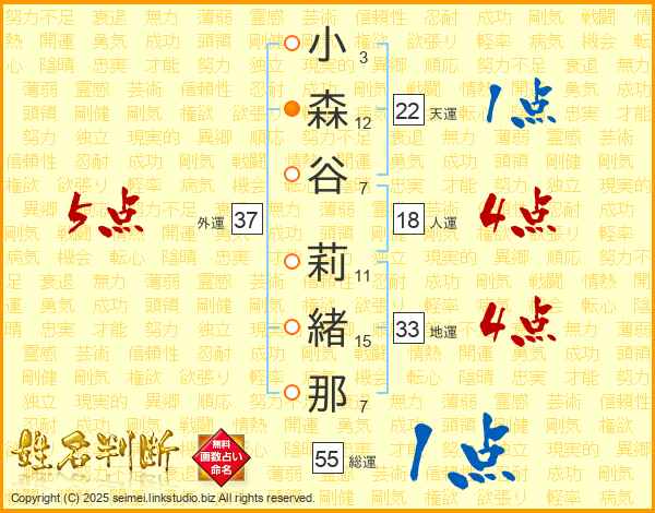 小(3画)森(12画)谷(7画) 莉(11画)緒(15画)那(7画)