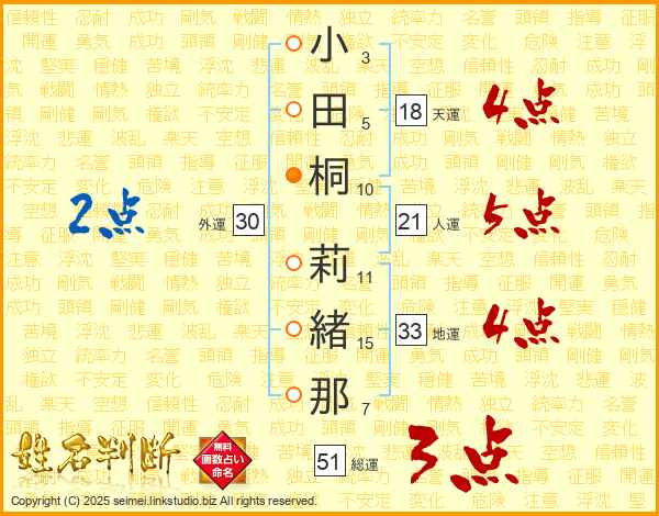 小田桐莉緒那さんの総運は51画の3点!