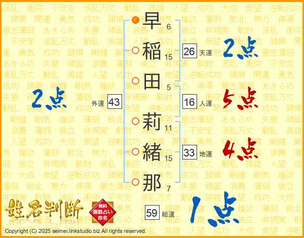 早(6画)稲(15画)田(5画) 莉(11画)緒(15画)那(7画)