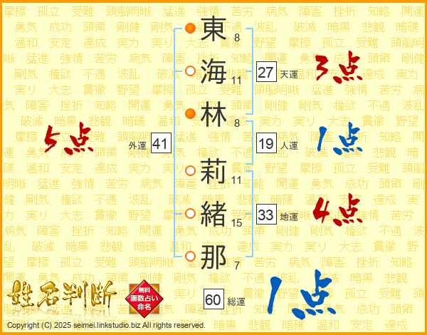東(8画)海(11画)林(8画) 莉(11画)緒(15画)那(7画)