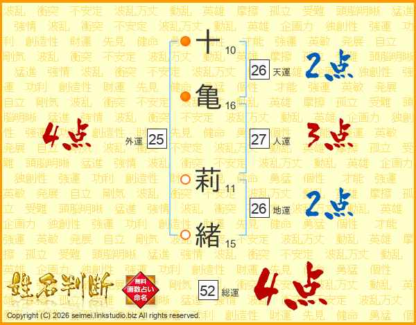 十(10画)亀(16画) 莉(11画)緒(15画)