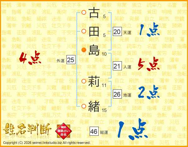 古(5画)田(5画)島(10画) 莉(11画)緒(15画)