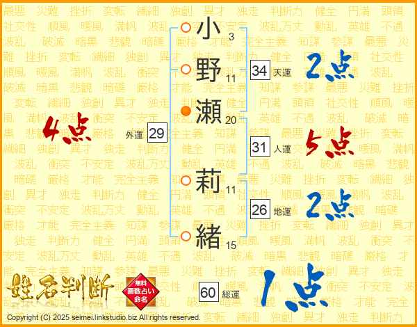 小(3画)野(11画)瀬(20画) 莉(11画)緒(15画)
