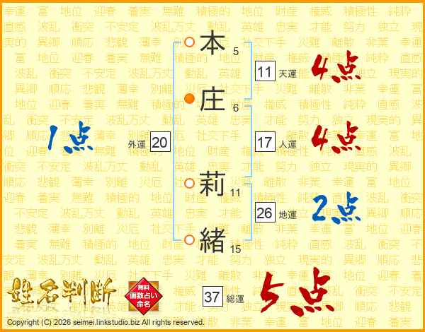 本(5画)庄(6画) 莉(11画)緒(15画)