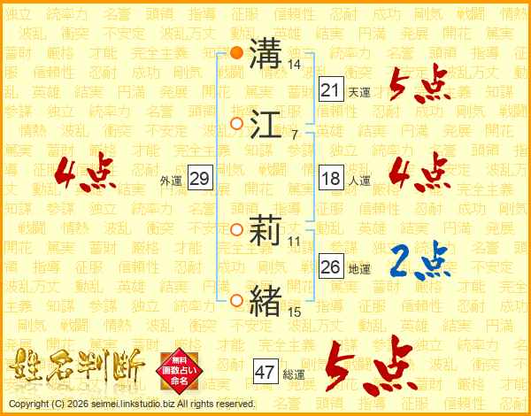 溝(14画)江(7画) 莉(11画)緒(15画)