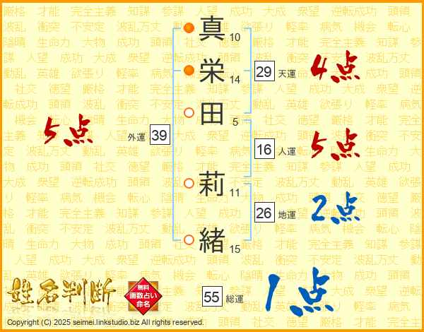 真(10画)栄(14画)田(5画) 莉(11画)緒(15画)