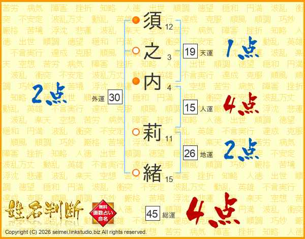 須(12画)之(3画)内(4画) 莉(11画)緒(15画)