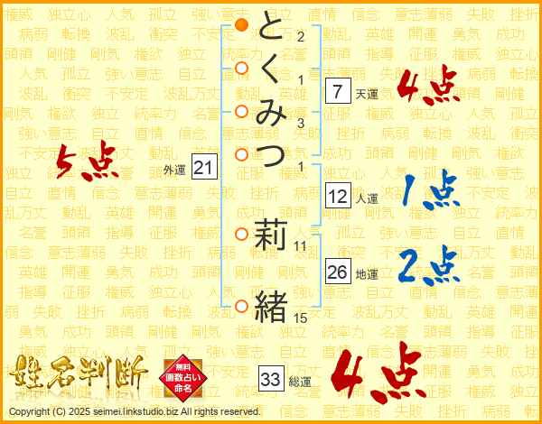 と(2画)く(1画)み(3画)つ(1画) 莉(11画)緒(15画)