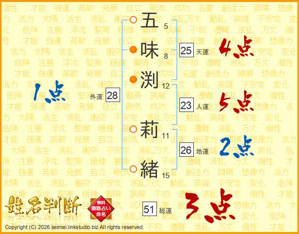 五(5画)味(8画)渕(12画) 莉(11画)緒(15画)