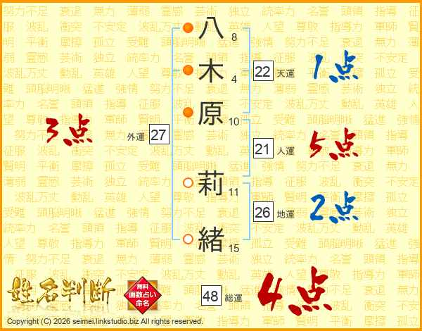 八(8画)木(4画)原(10画) 莉(11画)緒(15画)