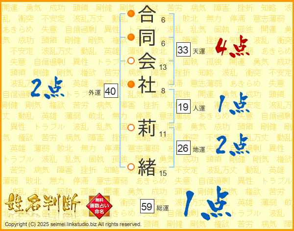 合(6画)同(6画)会(13画)社(8画) 莉(11画)緒(15画)