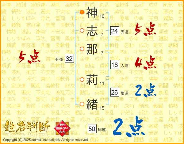 神(10画)志(7画)那(7画) 莉(11画)緒(15画)