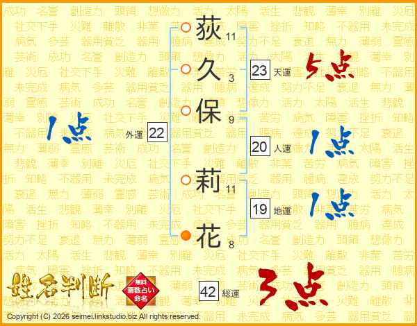 荻(11画)久(3画)保(9画) 莉(11画)花(8画)
