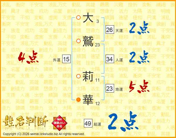 大(3画)鷲(23画) 莉(11画)華(12画)