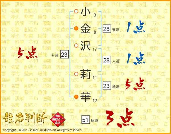 小(3画)金(8画)沢(17画) 莉(11画)華(12画)