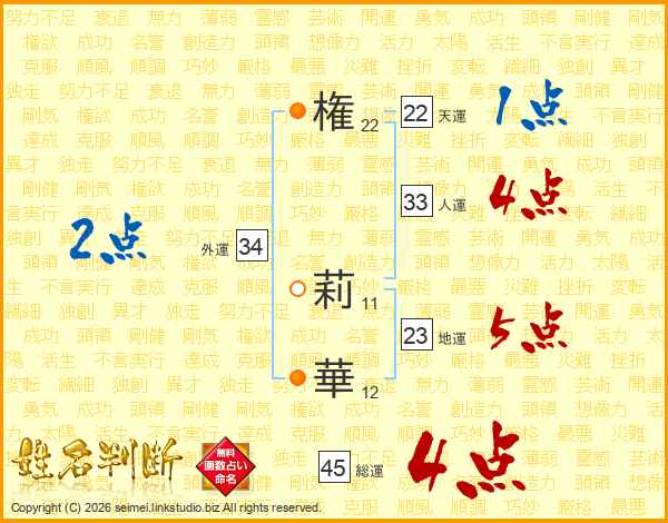 権(22画) 莉(11画)華(12画)