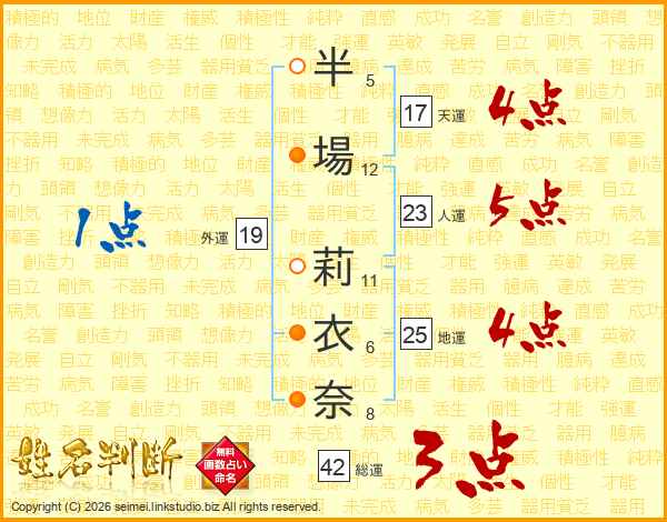 半(5画)場(12画) 莉(11画)衣(6画)奈(8画)