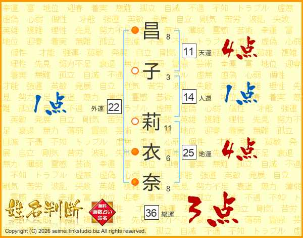 昌(8画)子(3画) 莉(11画)衣(6画)奈(8画)