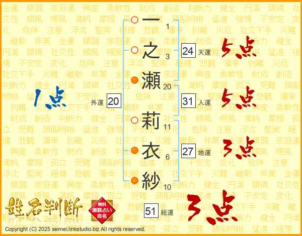 一(1画)之(3画)瀬(20画) 莉(11画)衣(6画)紗(10画)