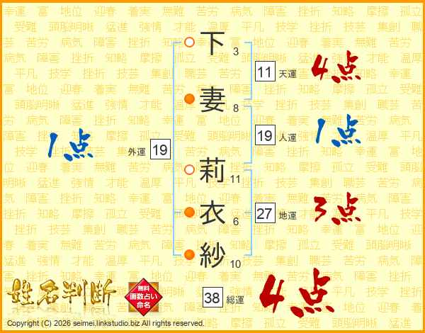 下(3画)妻(8画) 莉(11画)衣(6画)紗(10画)
