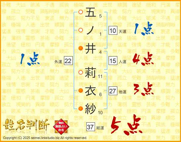 五(5画)ノ(1画)井(4画) 莉(11画)衣(6画)紗(10画)