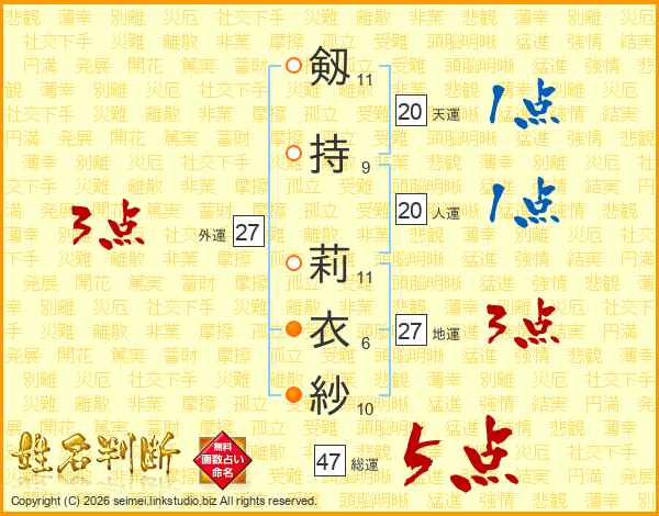 剱(11画)持(9画) 莉(11画)衣(6画)紗(10画)