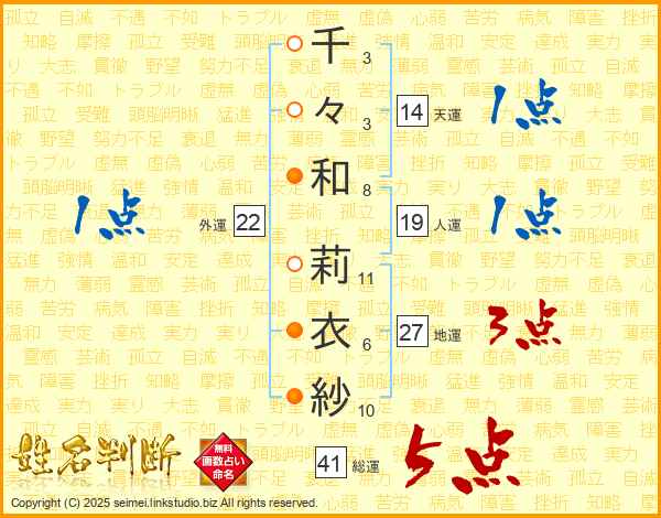千(3画)々(3画)和(8画) 莉(11画)衣(6画)紗(10画)