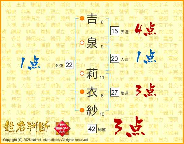 吉(6画)泉(9画) 莉(11画)衣(6画)紗(10画)