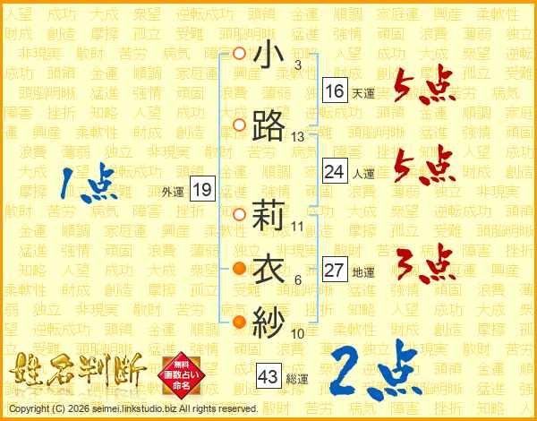 小路莉衣紗さんの総運は43画の2点!