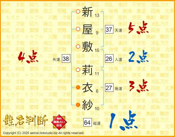 新(13画)屋(9画)敷(15画) 莉(11画)衣(6画)紗(10画)